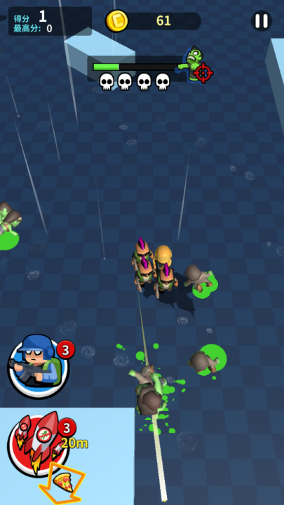 3、期间部分地区隐藏幸存者,击败僵尸后可前往拯救他们,玩家还可以升级英雄的火力,提升战斗能力。