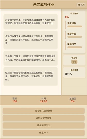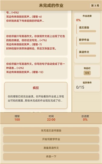 玩家需要在有限的时间内,通过选择先写哪门功课的作业(语文、数学、英语)或者选择休息,来推进游戏进程。在这个过程中,完成作业能够提升相应科目的进度,但同时也伴随着理智的损耗,因为诡异事件会在做作业时随机触发,影响玩家的状态。休息则可以恢复一定理智,还有机会发现实用物品。