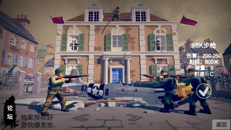 2、卡通与写实结合的造型和画面很有感觉:人物比例比较偏大头娃娃的卡通造型,但是身上的细节物品又比较尊重史实,基本是严格按照二战真实的单兵装具设计的,没有发现明显穿越的神剧服装造型。光影效果也采用了有些怀旧色彩的素绘效果。