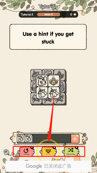 3、当然我们可以看得再长远一点,如下图这种情况,即便明面上两张卡牌都不够3张,但是我们就能够按照顺序点击直接消除2组卡牌。如果实在没有可以消除的卡牌的话,我们也可以使用位于最下方的3种作弊道具,最终达成通关。