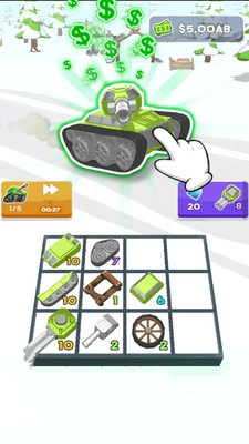 您将从基本坦克开始,购买更多零件,升级并赢得战斗,以创建您独特的坦克,战斗和生存。战略性地合并坦克以在战斗中生存。此外,您可以点击以获取更多金钱,升级收入,并合并两个相同级别的零件以获得更高级别的零件,使您的坦克更强大,并与敌人战斗。