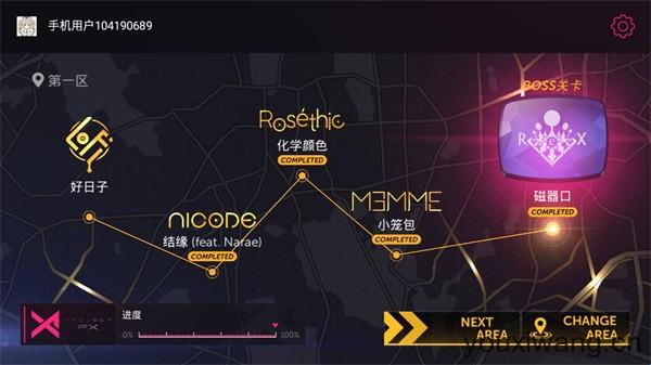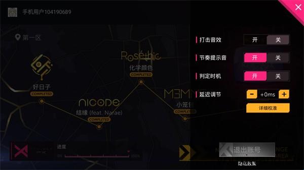 5、屏幕最上方的是歌曲进度,当进度条充满时就会结束闯关,通关后会根据玩家的分数来打出评分。