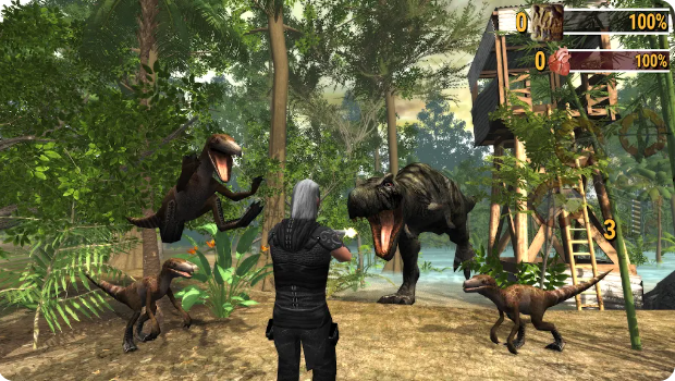 单人游戏和在线多人游戏(扮演动物)多人游戏选择扮演动物,最多可与20名玩家对战。单人游戏在你的恐龙刺客之旅中,你需要各种武器和各种方式来穿越这个危险的世界。你可以升级你的武器,包括:手枪弩(爆炸箭)、复合弓、近炸地雷/毒气罐、手枪、步枪。骑摩托车出行,你可以翻筋斗般从摩托车上下来,置身于战斗的中心;驾驶四驱越野车,你可以使用狙击步枪进行远距离击杀;乘船出行,或者你也可以选择步行进出战场,你忠实的朋友——马儿,只要吹口哨,就能帮你摆脱危险的恐龙困境。