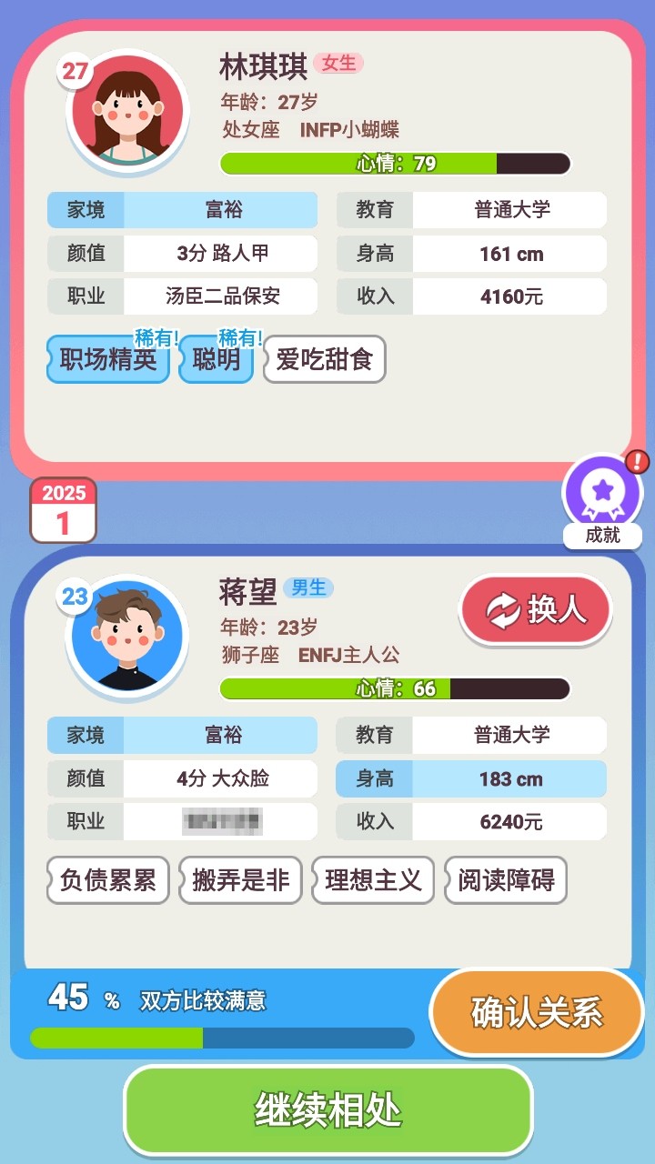 3、迎接新生命:备孕成功后,会有一段时间的“孕期”(游戏内通常为7-30天不等,根据游戏进度调整)。孕期内要照顾好伴侣的饮食起居,避免其过度劳累。孕期结束后,系统会提示“宝宝出生”,玩家可给孩子取名,并解锁“育儿”相关任务(如喂养、教育、陪伴成长等),孩子的性格、天赋会随机生成,且可能继承父母的部分特质。