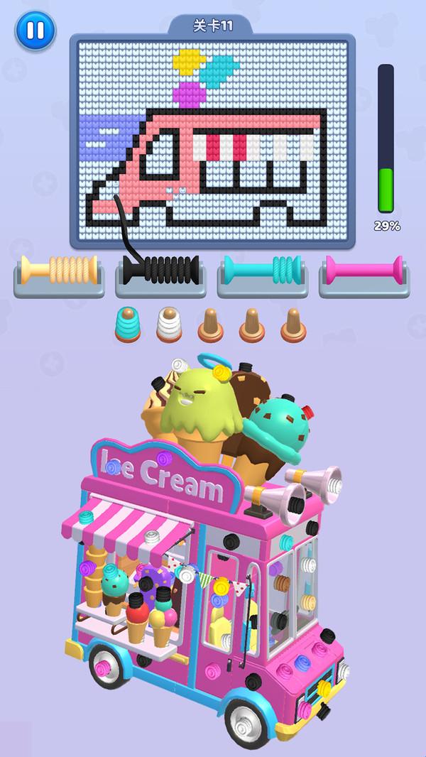 4、毛线材质会随季节变化,冬季关卡采用毛绒质感,夏季则变成清凉的冰丝视觉效果,消除时还有对应季节的音效。