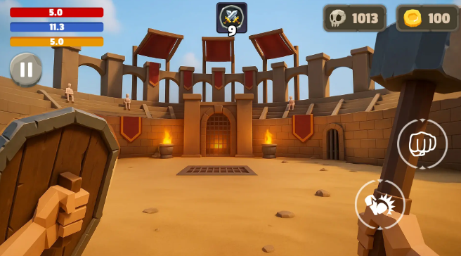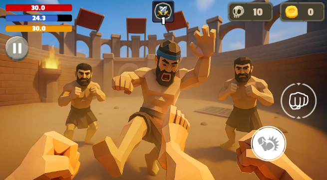 角斗士模拟器:竞技场之战游戏整体为卡通风格,在这里玩家们作为一名专业角斗士,需要与其他角斗士们完成这场比赛!全程第一人称视角,通过方向键盘控制角斗士出拳方式,仔细观察对手招收,灵活走位、避开危险,寻找弱点,一招制敌获取胜利!整个对战过程非常精彩,喜欢这类游戏的玩家们可以来试试喔!