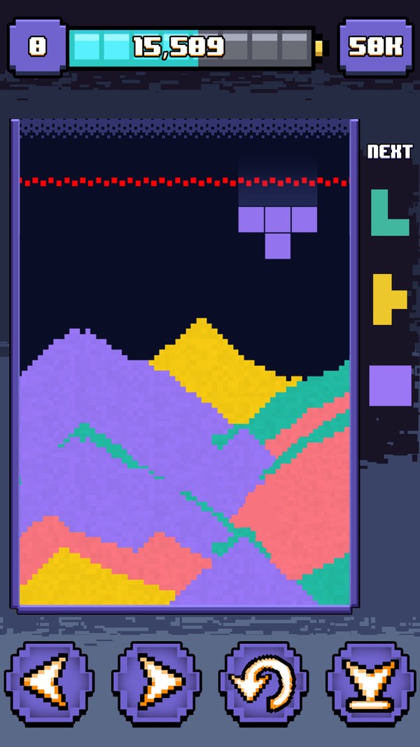 1、核心机制:游戏融合了传统俄罗斯方块的基础规则(如移动、旋转不同形状的方块进行堆叠),并加入独特的“流沙动态消除”特性。当方块触底后会转化为流动的沙粒,形成细腻真实的物理效果,玩家需引导流沙填满目标区域完成关卡挑战。