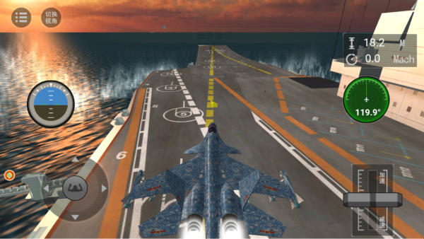3、如下图,使用右侧按钮来加速与减速,使用左侧的遥感来控制飞行方向。现在让你的战机成功从航母甲板上起飞吧!