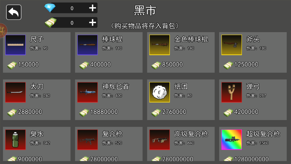 3、玩家可以在游戏中去装备不同的武器,武器本身也需要进行购买并携带。