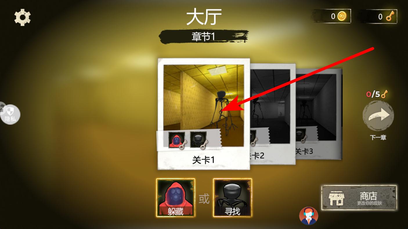 2、场景选择界面,可选择不同的关卡章节1的等进入,不同关卡有着不同的场景布局与危险情况,需根据场景特点采取应对策略。