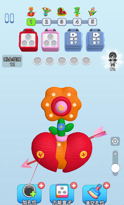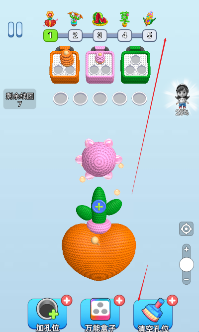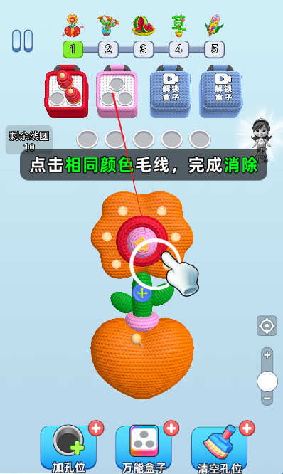 2、选择道具:进入关卡后,在游戏界面的特定位置(通常是底部或侧边)会显示已拥有的道具图标。根据当前关卡的挑战需求,点击选择合适的道具,比如需要快速消除大量同色毛线时,可选择范围消除类道具。
