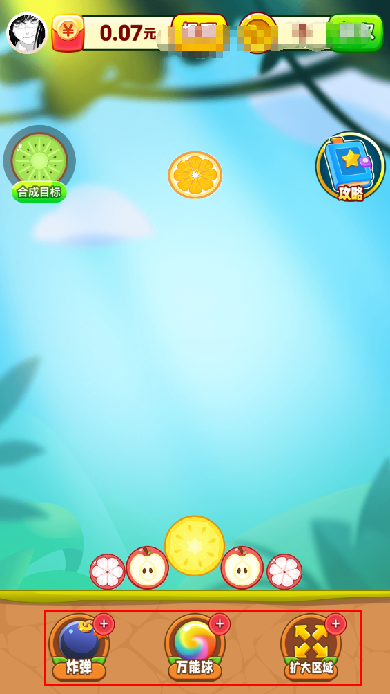 3、相同的水果就能完成合成,要注意控制下落的位置