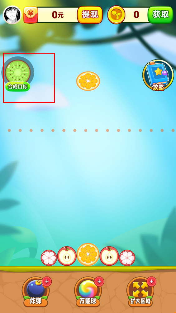 2、这是游戏的主界面,通过控制水果下落的方式进行合成