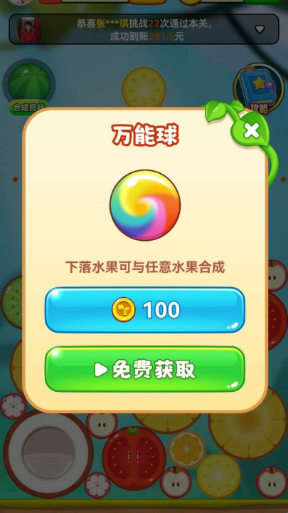 2、道具使用:游戏中提供了一系列神奇道具,玩家可以在关键时刻使用这些道具来帮助顺利通关。例如,使用道具可以消除特定的水果、清空整行或整列,甚至将两个不同水果合并在一起。