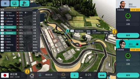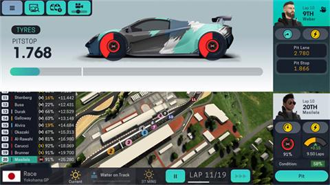 4、车手信息:屏幕左右下角会出现你的车队两名车手的信息,包含维修站、策略、状态调控,而信息内容包含名次、区段、距离比较、油量、轮胎磨损以及驾驶模式所导致的油耗、轮胎磨损状况。
