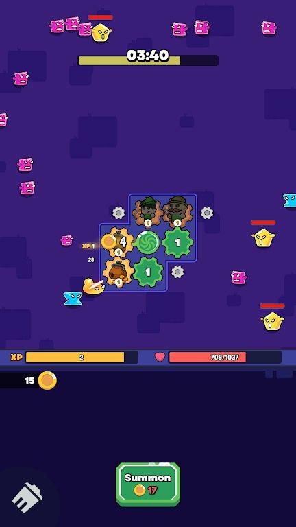 史莱姆围城齿轮防御是一款融合了塔防和建造玩法的趣味小游戏,玩家要放置齿轮生产史莱姆士兵来抵抗怪物的入侵,通过齿轮的联动增强士兵的生成效率和能力,击败敌方获得经验提升等级解锁更多强力的史莱姆士兵。史莱姆围城齿轮防御游戏关卡数量很多,击退强敌后培养自己的士兵来增强军团实力,击败强大的敌人守护城堡的安全吧。