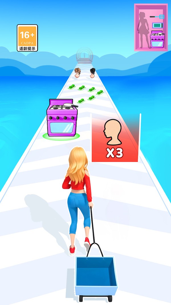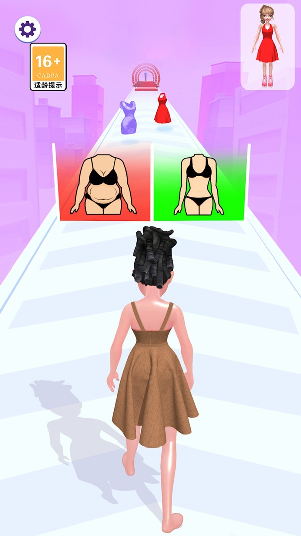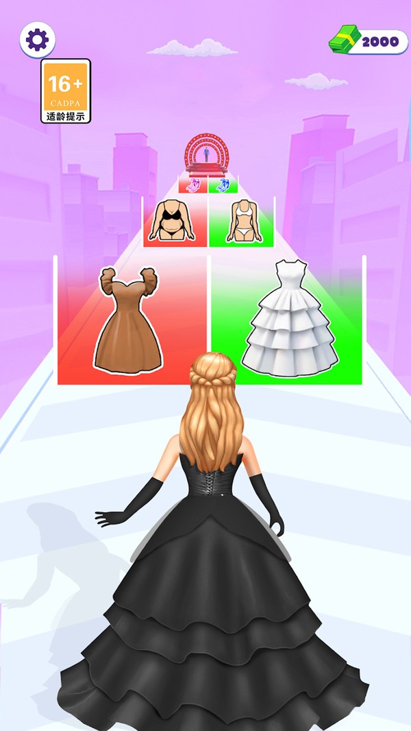 2、一边奔跑,一边收集金钱等资源,同时根据指示选择合适的时尚元素,为角色打造独特造型。