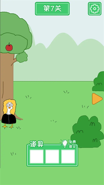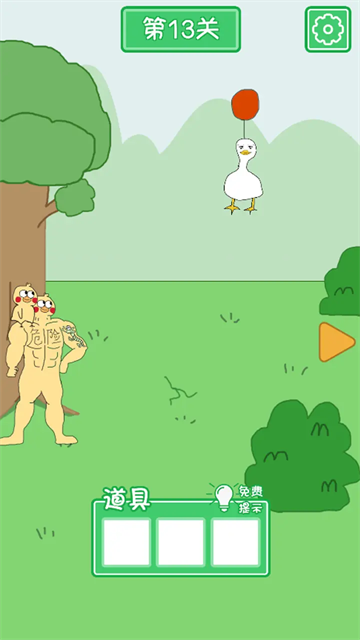 第6关:先点击右下边的灌木丛,接着点击铲子。得到铲子后,将铲子拖动到草地上的裂缝处,接着点击小鸭子。得到小鸭子后,点击向右箭头到右边去。在右边,将小鸭子拖动到肌肉鸭手上,接着点击左上边灌木丛旁的树枝。得到树枝后,点击向左箭头到左边去。在左边,点击右上边的灌木丛,接着点击鱼。得到鱼后,点击向右箭头到右边去。在右边,先将树枝拖动到水中,接着阿静气球拖动到树枝上,然后将鱼推动的气球绳上就过关了。