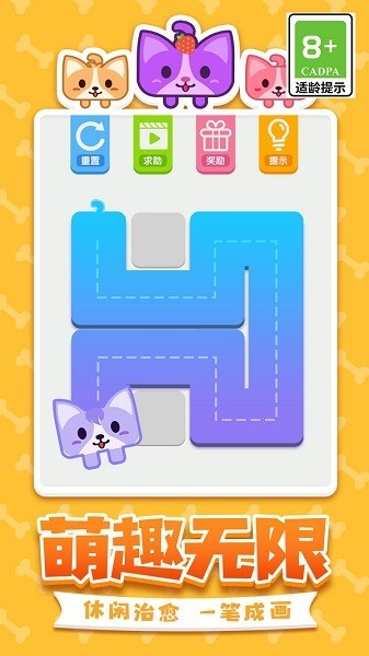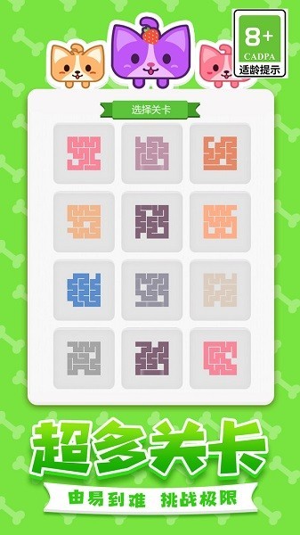 数百个由易到难的关卡设计,开动你聪明的小脑瓜,带领可爱汪汪一笔走完所有格子吧!