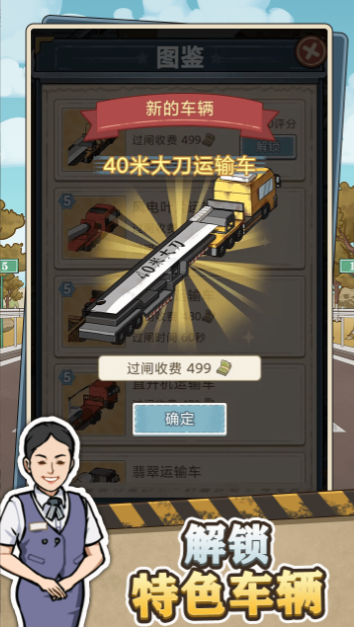 2、特色车辆:游戏中有多种特色车辆,如40米大刀运输车、风电叶片运输车等,等待玩家解锁。