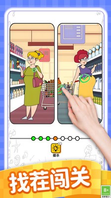 是一款趣味满满的找茬类休闲益智小游戏,通过敏锐观察找出两幅图中的差别。每一关都是全新挑战,点击差异处即可通关。