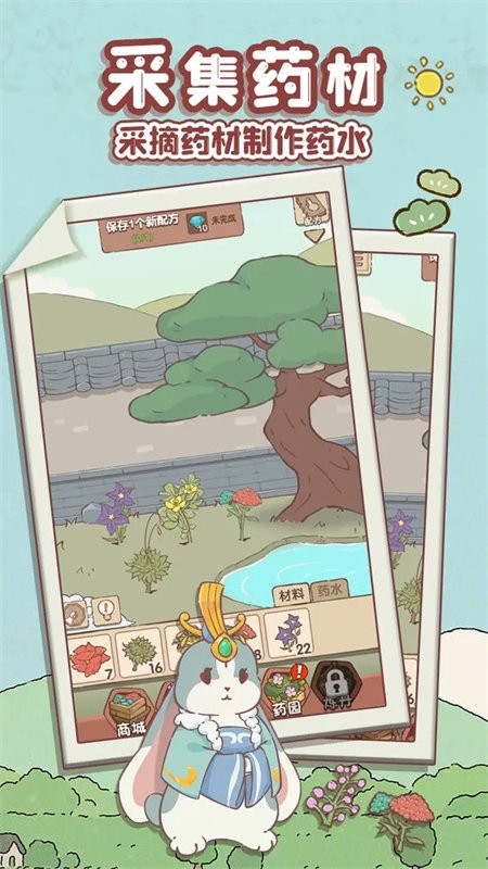 兔与药游戏是一款以捣药为题材的模拟经营手游。画风可爱,新颖的制药玩法,音乐优美,日夜转换机制。玩家扮演的是玉兔药水铺的经营者,需要学习如何制药、采药和售药,打响店铺在天庭中的知名度。