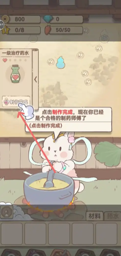 4、搅拌好药锅之后,点击旁边的荷叶进行加热,弹出一级治疗药水,点击制作完成即可。