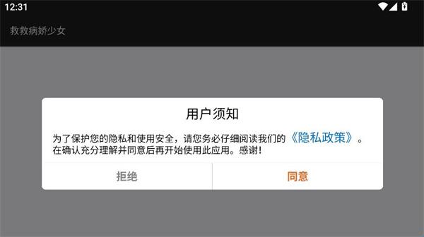 1、在自己的安卓手机上下载安装救救病娇少女游戏,仔细阅读用户协议后点击同意。