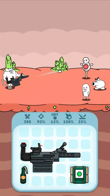 枪神英雄是一款策略射击类小游戏,整体为卡通风格,游戏中玩家们将和这只酷酷的小猫咪一起来完成这次挑战!选择合适的武器来进行对战!每完成一波射击都可以获取丰厚的奖励,解锁新器械、合并升级、提高其战力值喔!到后期你还可以搭配防御盔甲、炸弹等,合理利用好每一件道具,不断磨练,成为真正的射击高手吧!