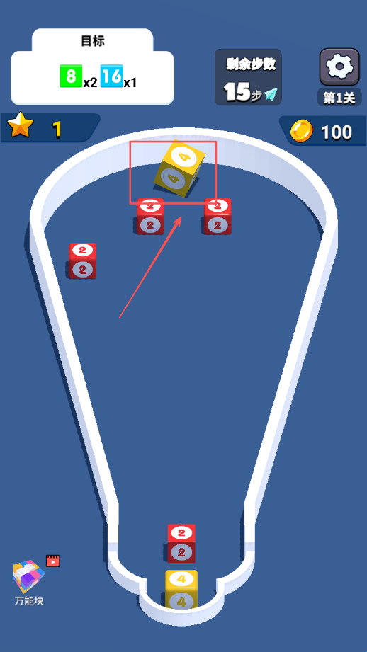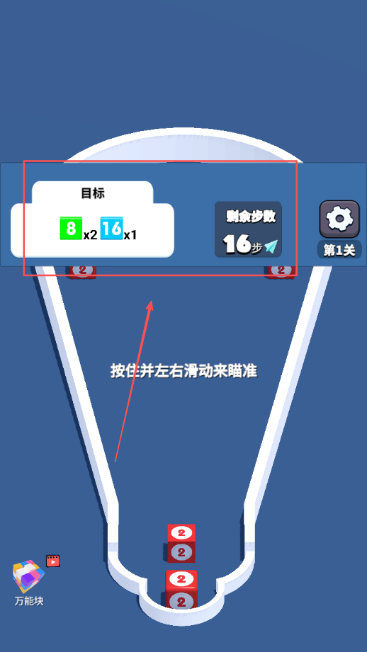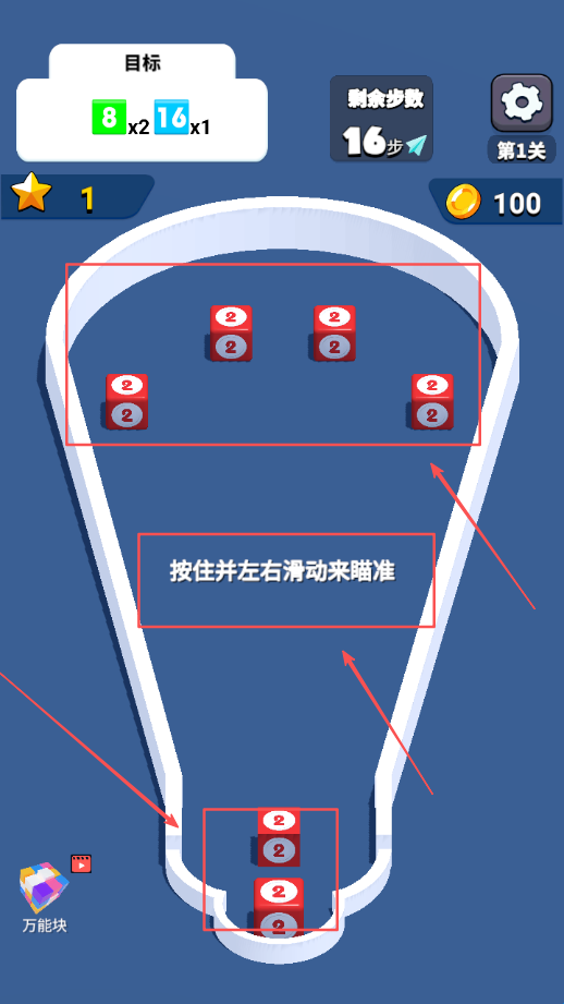 1、刚进游戏要先调整好射击的角度,对准相同数字的方块发射,让它们合并到一起,每完成一次这样的操作,都会新生成一个数字块。