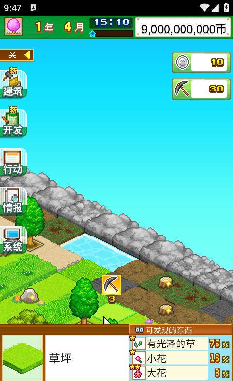 游戏进行一段时间后就可以获得“铁镐”。在奖牌下面的就是获得的挖掘点数啦~通过挖掘草地和未知区域,可以获得不同的道具素材。