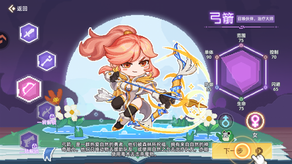 弓箭,是一群热爱自然的勇者,他们被森林所祝福,拥有来自自然的神奇能力。他们召唤动物去援助队友,或使用自然之力去治疗队友,亦能使用毒术去击杀魔物。