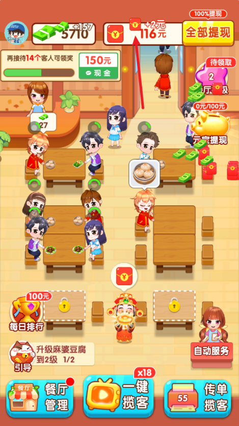 我的饭店真的可以挣钱吗?我的饭店是一款经营类小游戏,进入游戏后根据左上角提示接待客人即可获取奖励,每一笔收益都可以转化为红包,到达一定的额度即可提现到手机喔!游戏到后期回更加考验玩家们的经营头脑,通过发传单招揽客人、合理分配好每一位员工工作,尽可能将利益最大化!