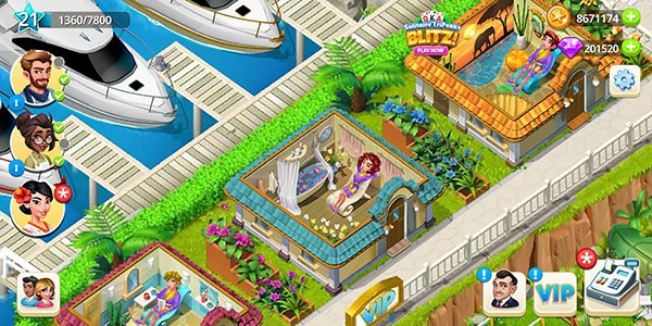 我的美容水疗中心是一款融合了好莱坞故事、城市建筑和农场种植玩法的模拟经营类手游,该游戏拥有非常明亮鲜艳的颜色背景,这也非常符合夏日度假村的设定,玩家进入游戏便能感到扑面而来的夏日度假气息。而你在游戏中扮演的正是这家度假村的经营管理者,你需要在度假村中打造出一个庞大的美容水疗中心,为来来往往的游客提供各项美容服务,这些服务涵盖了按摩、美发、美甲、足浴、化妆、香薰等内容。