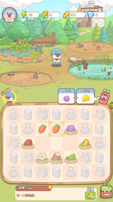 2、玩家需通过点击农场来获取作物,并在下方合成栏通过合成相同两种作物,来获取更高等级的作物;