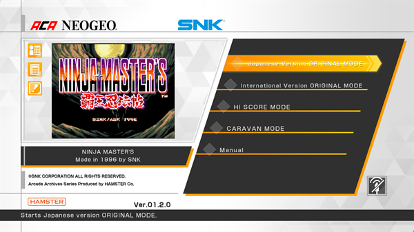 NINJA MASTER'S是 SNK于 1996年发行的一款格斗游戏。故事背景设定在日本国,十二位在战场上被称为恶魔的勇者,无论手持武器还是徒手格斗,都会在精彩的组合技和特殊攻击中展开激烈的对决。不要错过任何精彩动作,从提升伤害的力量槽,到带来精彩动作的超级燃爆模式!