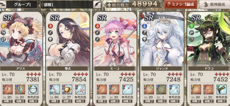 9、H难度通了后接下去打EX难度,快速打穿不是问题,下图是用来确认素材掉落位置的队伍,只开了专武,差不多大概能打穿。