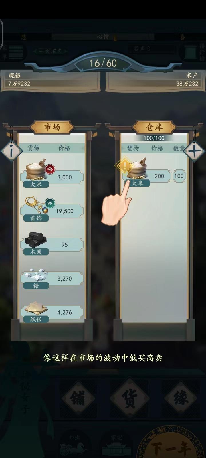 6、市场:点击物品可购买/出售,低买高卖,扩充物资资本,完成资本积累