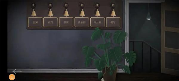 14、向左滑动,来到别墅,进入。玩家一:打开门,下滑下楼,点开酒塞,点击绳子,点击右侧玻璃罐后的壁虎,等它爬到左侧后,再次点击,直到壁虎进入笼子。至此三条信息全部出现。玩家二:花盆下纸条得知,需要按规律敲铃铛才能进入下面的场景。