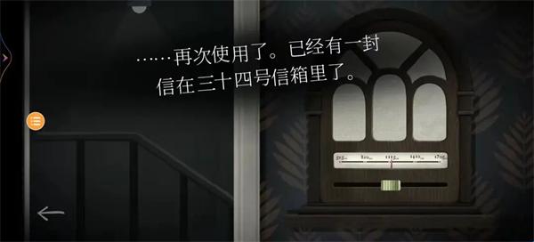 24、回到上方,依旧调频,这次玩家一和玩家二的位置互换,交换线索。玩家一:得到信息34号信箱有一封信。玩家二:得到信息,信箱可以使用。