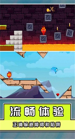 1、经典的冰火人角色,具有不同的技能,需要玩家们灵活操控,完成冒险闯关任务。