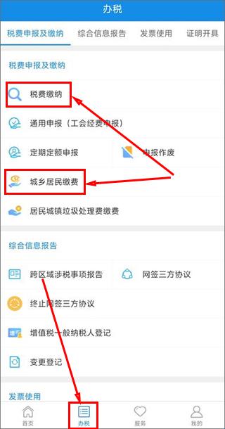1、缴费人以个人为缴费主体,在App底部菜单选择“办税”--“城乡居民缴费”或“税费缴纳”;