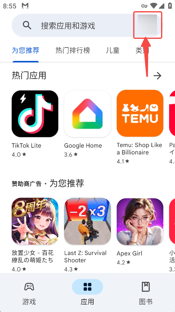 1、打开app,首选需要登录谷歌账号,没有的话先创建账号。登录主页可以在应用中查看推荐的应用。