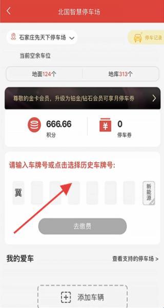 3、停车场页面可实时查看石家庄先天下停车场车位情况,车主输入车牌号或选择历史记录即可缴费,金卡会员升级还可享停车券。