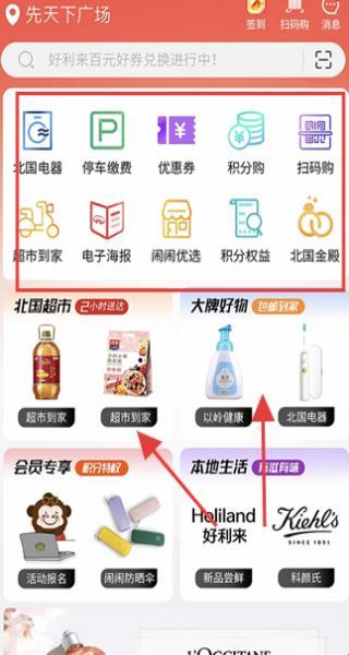 1、APP功能多样,首页涵盖北国电器、停车缴费、优惠券等众多服务入口,超市到家可实现2小时送达,方便用户采购日常用品。