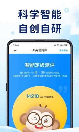 ai英语测评是一款专业的英语学习软件,这款软件为大家提供了诸多的学习资料,能够对用户的语音、语调、语音音素等进行分析,提供个性化的英语水平测评,并以此来为用户定制专属的学习计划,除此之外,软件还可以对语法、发音、用词等方面进行智能纠错,让用户轻松掌握英语,有需要的朋友快来下载体验吧。