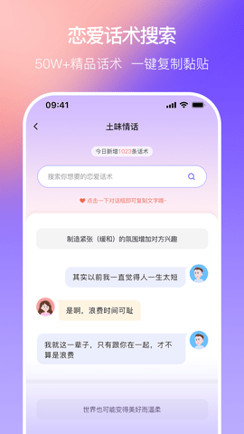 1、50万+恋爱聊天话术:搜索对方的话,复制黏贴即可轻松追到对方。