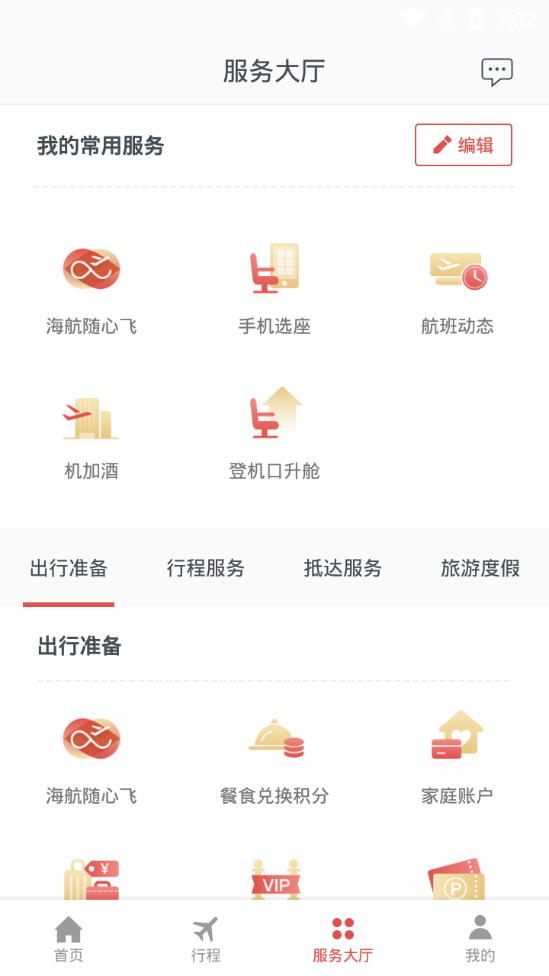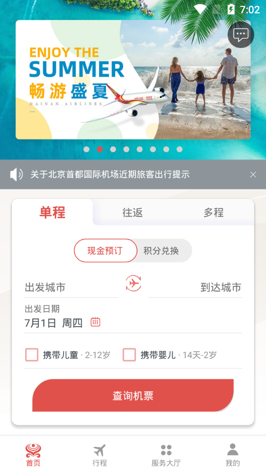 1、【机票预订】-支持海南航空及海航旗下其它多家航司的现金购票及改期升舱。