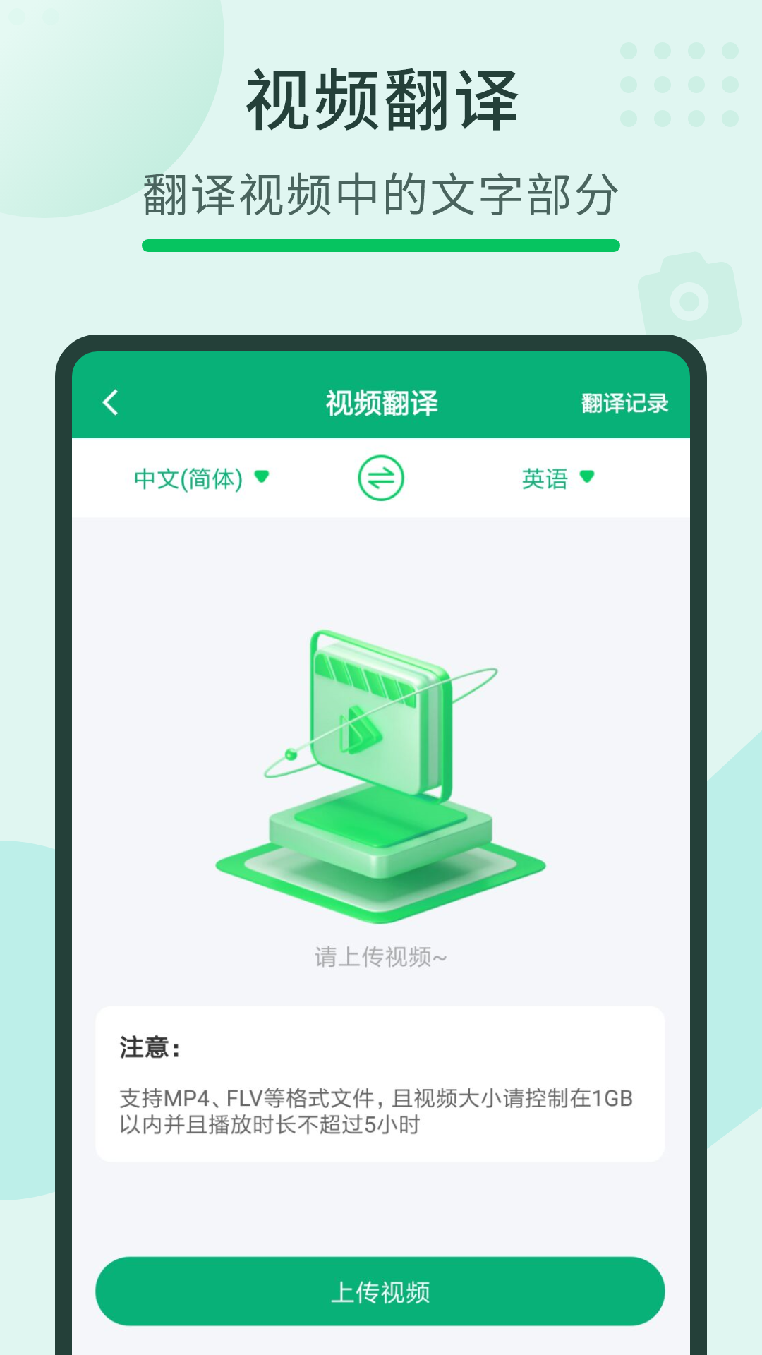 4、支持视频翻译功能,录下的小视频或者下载的小视频,上传即可得到视频内容的翻译结果;