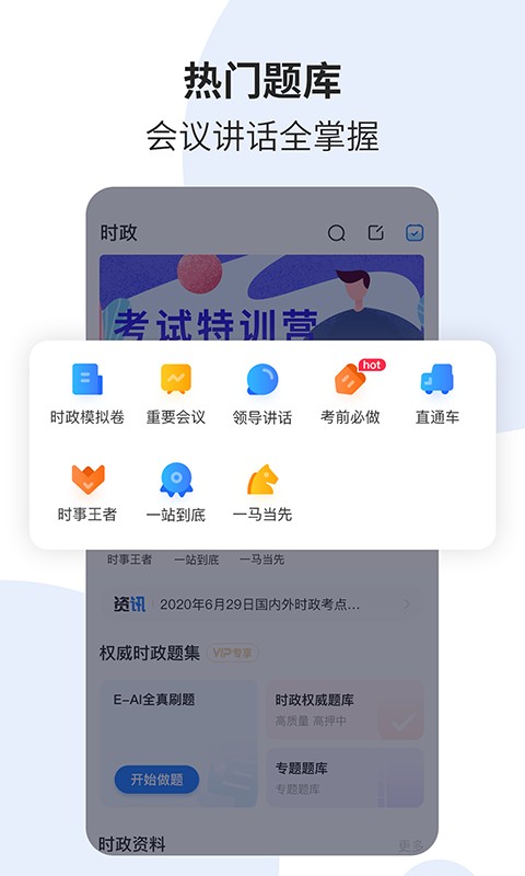 2、考试题库:针对每日时政不断更新题库,拥有时政权威题库、重要会议、领导讲话、中高考必做时政、时政模拟卷、事业单位职测等多种分类题库,内容丰富,助你快速了解考点,轻松应对各类考试;